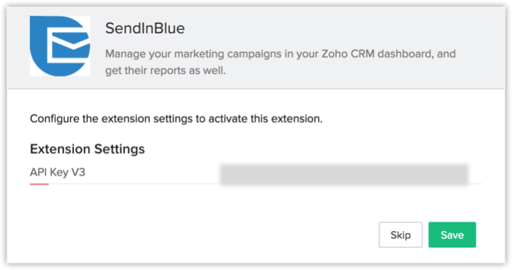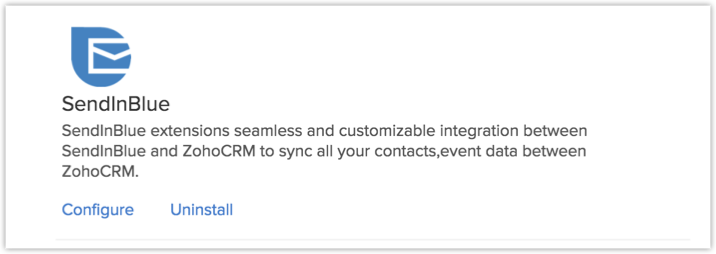 You can install the SendinBlue extension either from Zoho Marketplace or from within your Zoho CRM account as follows: